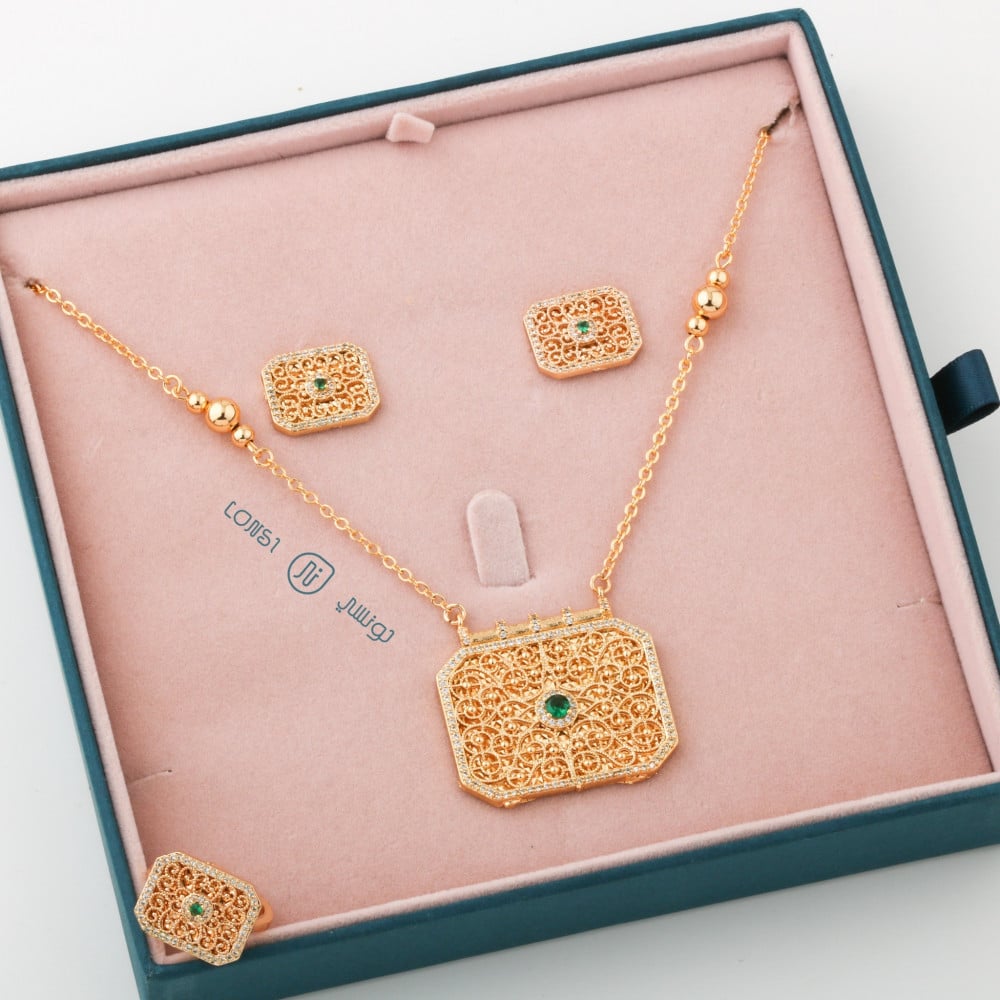طقم ناعم نسائي من لونسي باللون الذهبي والمطلي بماء الذهب عيار 21 الآمن على البشرة ، يتميز الطقم بأنه مكون من سلسال وخاتم وحلق معا يمكنك ارتدائها معا او منفصله ، طبق الأصل من الذهب وصمم خصيصا لعشاق الذهب . يقدم الطقم في علبة فاخرة مناسبة للاهداء . وكذلك الخاتم مفتوح ليناسب جميع المقاسات .