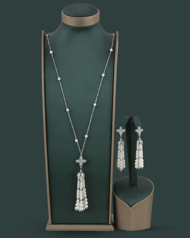 طقم ناعم نسائي من لونسي باللون الذهبي او الفضي والمطلي بماء الذهب عيار 18 الآمن على البشرة ، يتميز الطقم بأنه مكون من سلسال طويل وحلق معا يمكنك ارتدائها معا او منفصله ، طبق الأصل من الذهب وصمم خصيصا لعشاق الذهب .