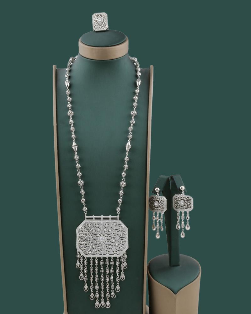 طقم فخم نسائي من لونسي باللون الفض والمطلي بماء الذهب الابيض عيار 18 الآمن على البشرة ، يتميز الطقم بأنه مكون من سلسال طويل وحلق معا يمكنك ارتدائها معا او منفصله ، طبق الأصل من الالماس وصمم خصيصا لعشاق الالماس . يقدم في بوكس لونسي المناسب للاهداء .