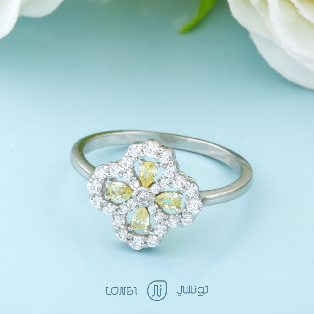 خاتم فضة ناعم عيار 925 بتصميم متفرد ، خاتم أنيق ناعم مرصع بفصوص الزركون البراقه ومناسب للبس اليومي ، صمم الخاتم باللون الفضي بطلاء الروديوم الآمن على البشرة .
