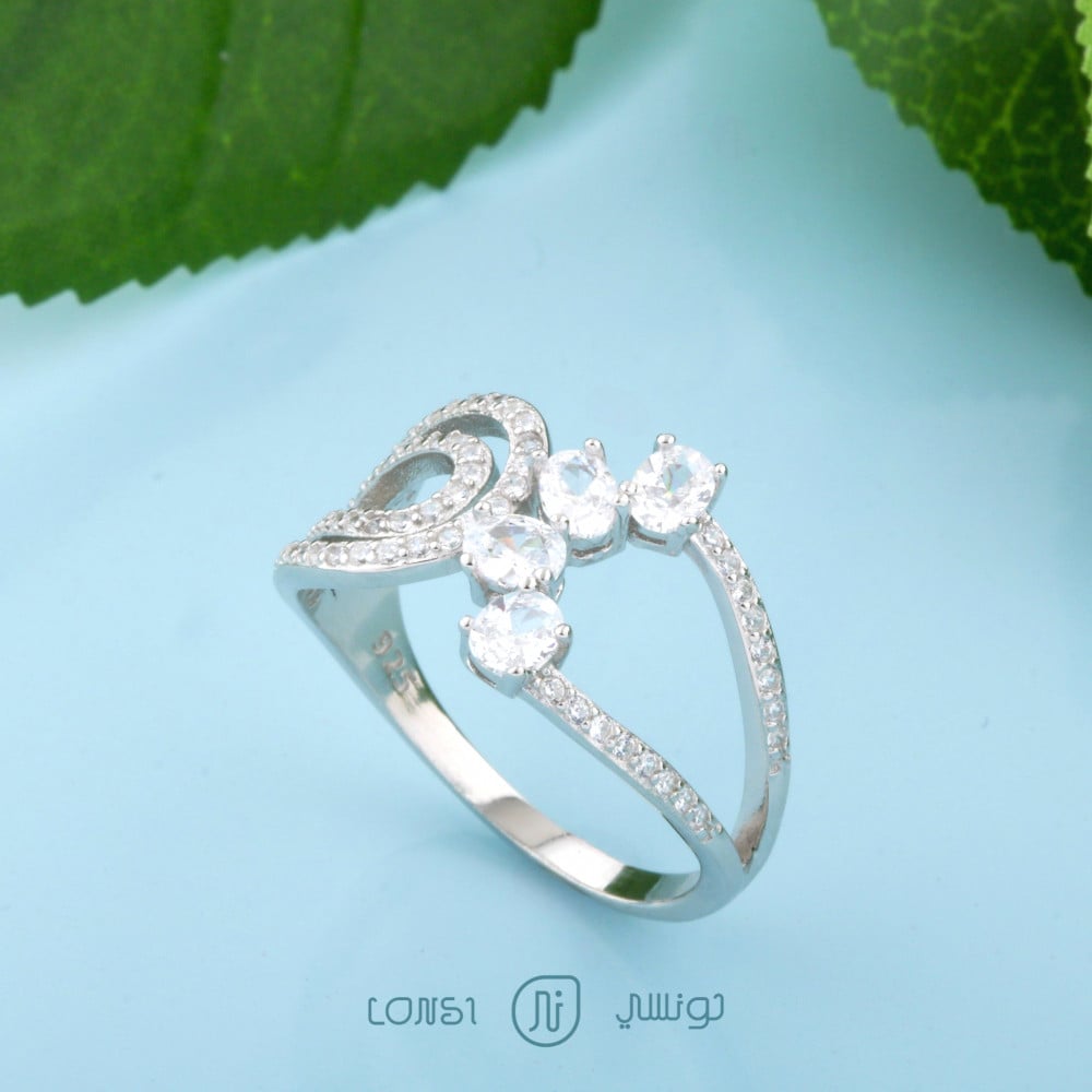 خاتم فضة ناعم عيار 925 بتصميم متفرد ، خاتم أنيق ناعم مرصع بفصوص الزركون البراقه ومناسب للبس اليومي ، صمم الخاتم باللون الفضي بطلاء الروديوم الآمن على البشرة .