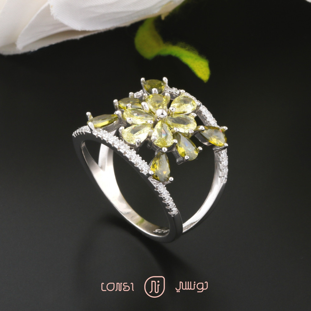 خاتم فضة ناعم عيار 925 بتصميم متفرد ، خاتم أنيق ناعم مرصع بفصوص الزركون البراقه ومناسب للبس اليومي ، صمم الخاتم باللون الفضي بطلاء الروديوم الآمن على البشرة .