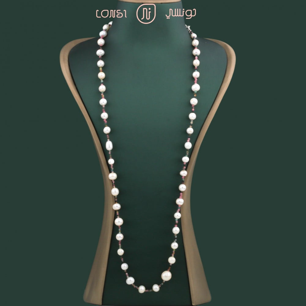 الاحجار الكريمة رمز اناقة المرأة ، حيث تعتبر مجوهراتك مرآة أناقتك ، فاختاريها بذكاء متناهي. لذلك اخترنا لك هذا العقد الفاخر من الؤلؤ الطبيعي والاحجار الكريمة المتنوعه بتصميم متناسق بشكل مثالي في القطعة الواحدة بل وزادته فخامة تعليقة من الفضة الاسترليني لتزيد أنوثتك ،