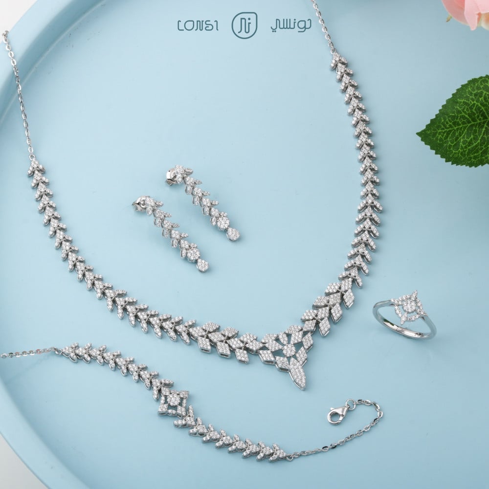طقم فضة ناعم عيار 925 بتصميم الالماس ، طقم أنيق ناعم مرصع بالزركون البراق ومناسب للبس اليومي ، صمم الطقم باللون الفضي بطلاء الروديوم الآمن على البشرة . صمم الطقم ليضيف أجمل لمسة من الاناقه على مظهرك في أجمل أيام العمر وكذلك المناسبات الخاصة . يقدم الطقم في علبة فاخرة مناسبة للاهداء .