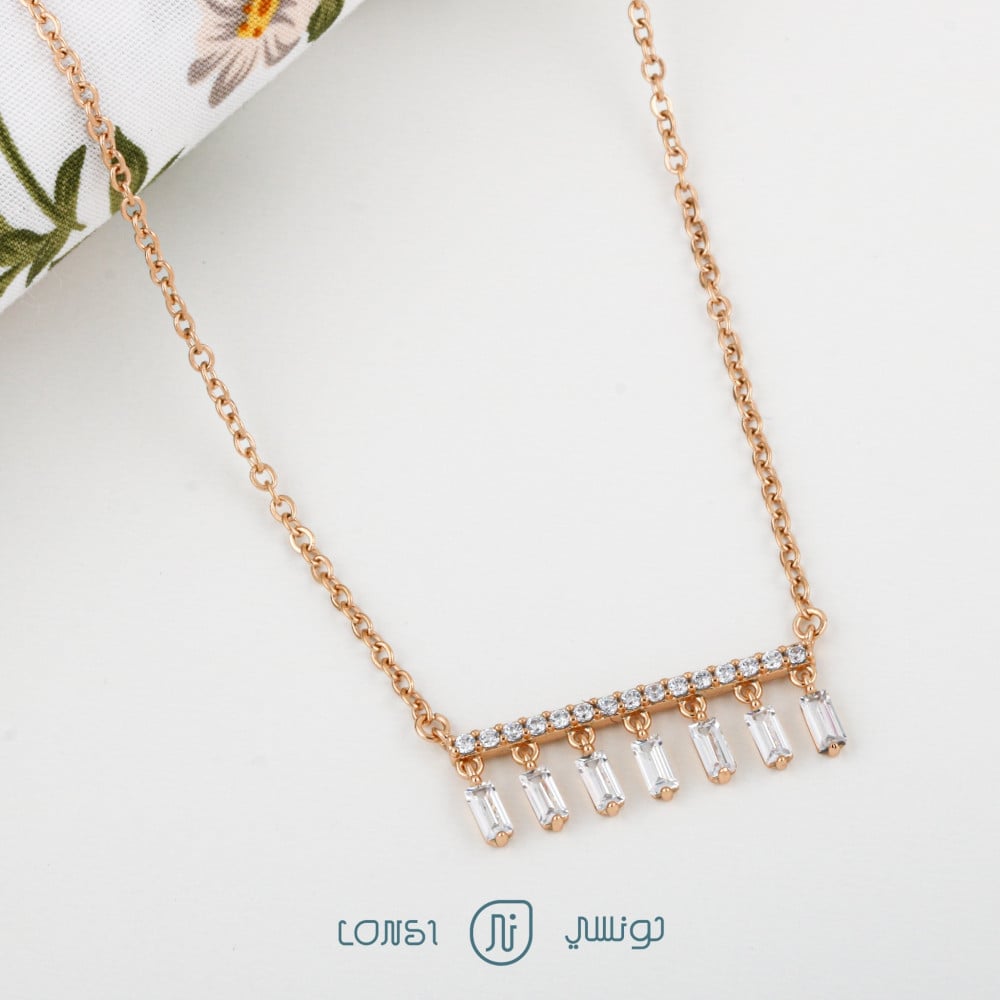 سلسال نسائي من ماركه لونسي ، سلسال أنيق ناعم مرصع بفصوص الزيركون البراقه ومناسب للبس اليومي ، صمم السلسال باللون الذهبي بطلاء الذهب عيار 21 المائل للروز .