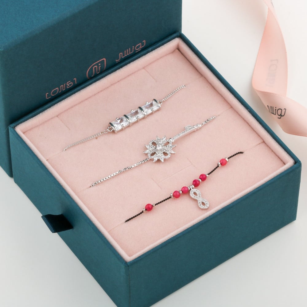 3 اساور نسائيه من ماركة لونسي ، طقم ثلاث اساور باللون الفضي بتصاميم ناعمه مختلفه ، صممت الأساور بتصاميم أنيقه وبسيطه يمكنك إرتدائها كل واحده على حده او إرتدائها سويا ، تتميز الأساور بقفل سحب ليناسب مقاس معصمك ، ويمكنك تنسيق و إرتداء الاساور الثلاث معا مع لبس أنيق لطله أنثويه . لتحظي بتجربه ممتعه وفرنا لك : بوكس وتغليف مجاني جذاب وأنيق مناسب للاهداء ،